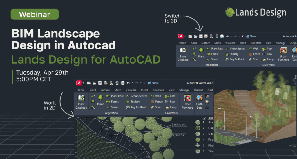 Participe en nuestro próximo seminario web y descubra cómo Lands Design le ayuda a transformar su entorno de AutoCAD en una potente solución para diseño paisajístico profesional, combinando modelado 3D, diseño de plantación, herramientas de terreno y funciones BIM avanzadas.