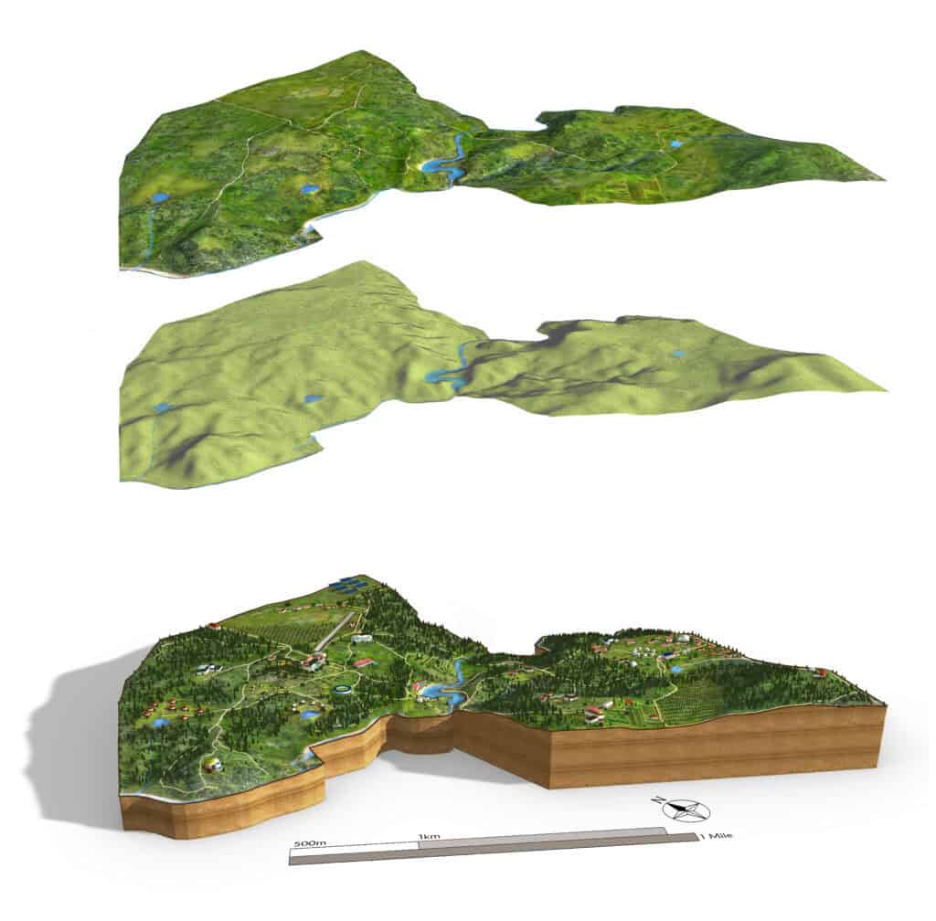Using RhinoLands and QGIS, a highly accurate 3D model was created remotely, utilizing precise topographic data from a LiDAR drone survey. This ensures that the model is highly representative of the real landform.